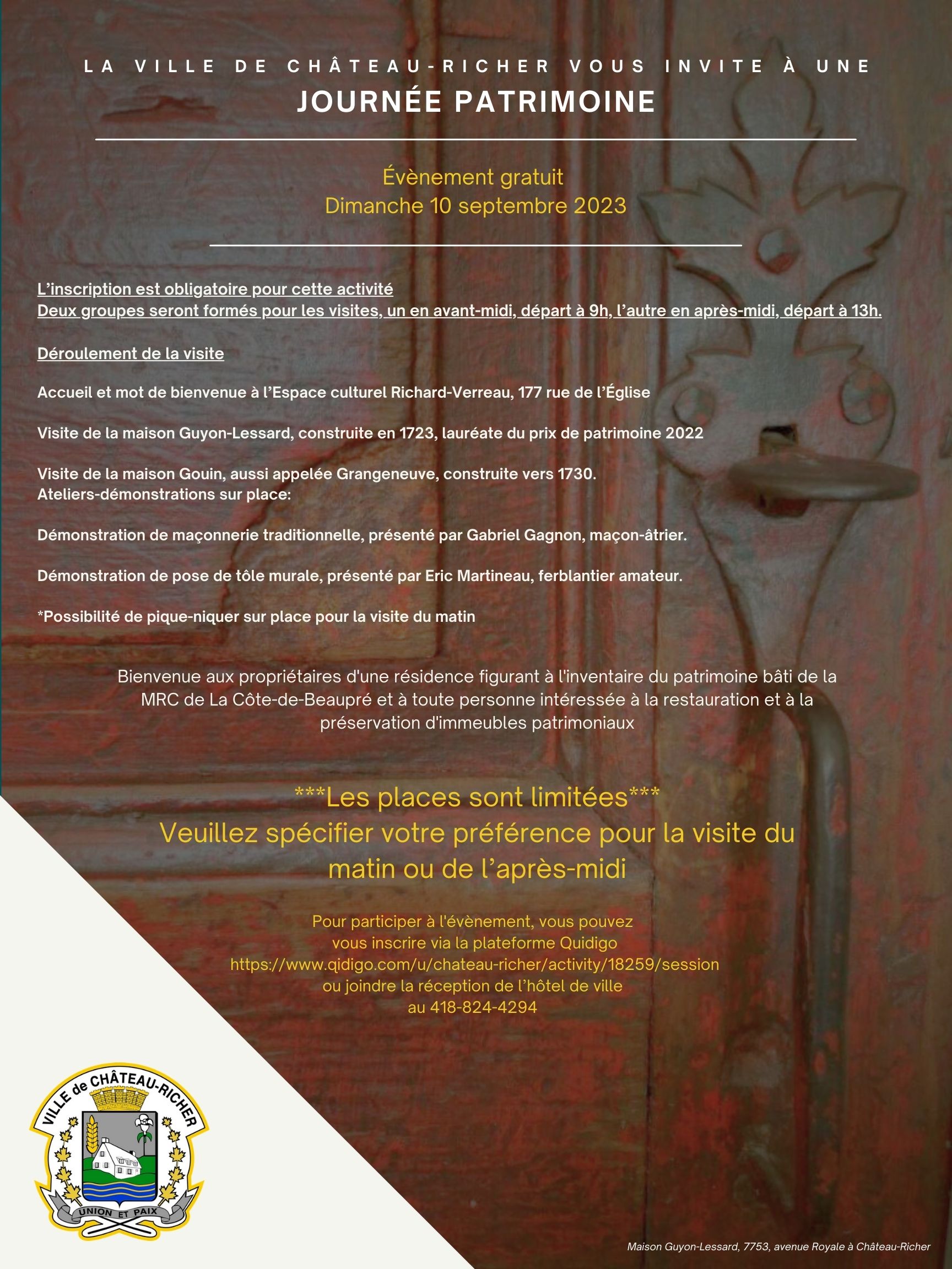La Ville de Château-Richer vous invite à une "journée patrimoine", le dimanche 10 septembre 2023. Pour plus de détails, cliquez ici !