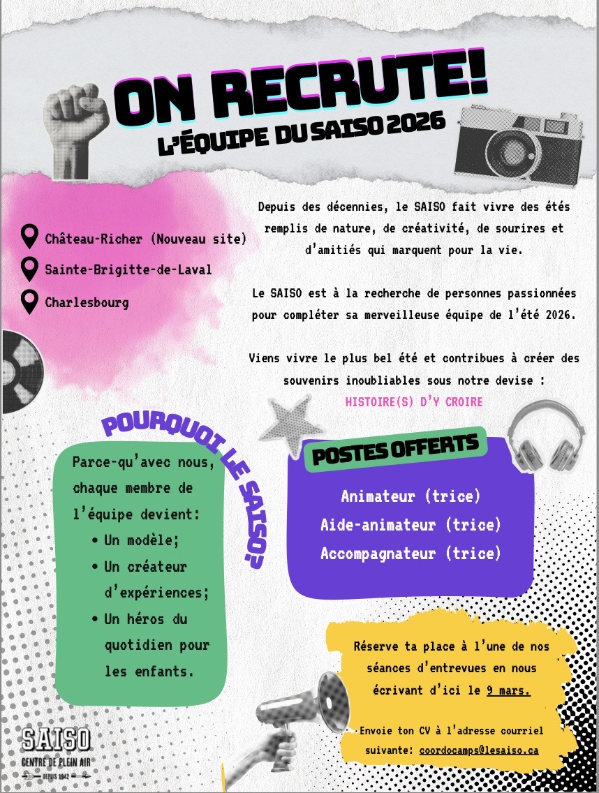 Camp de jour 2026 - Offre d'emploi Le Saiso - Château-Richer